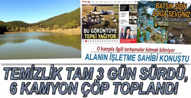 Yağmur nedeniyle salı günü başlanan bölgedeki temizlik çalışması 3 günde tamamlandı. Göl ve gölün etrafındaki çöpler tamamen temizlendi. Yaklaşık 2 bin 500 çadırın kurulduğu kamp alanından 6 kamyon çöp toplandı.