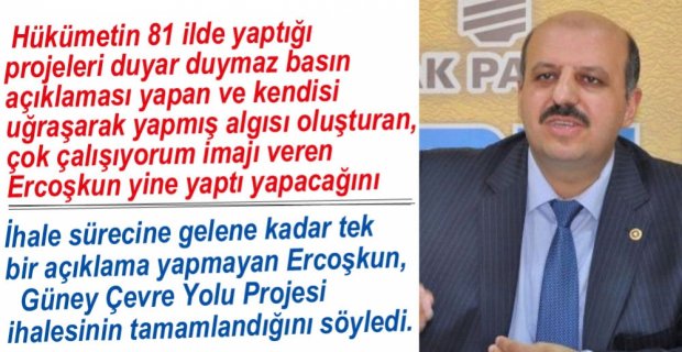 Hükümetin 81 ilde yaptığı her projeye basın açıklaması yaparak bazılarını kendisi uğraşarak yapmış gibi algı oluşturan AK Parti Bolu Milletvekili Ali Ercoşkun, AK Partili Bolu Belediye Başkanı Alaaddin Yılmaz’ın aylardır ihalesi için uğraştığı Güney Çevre Yolu Projesi sahiplenerek ihalenin tamamlandığını söyledi. Ercoşkun, “Bolu Merkez’de Güney Çevre Yolu Projesi’nin ihale süreci tamamlandı, müteahhit firma ile imzalar atıldı. Allah’ın izniyle hayata geçecek 90 milyon TL’lik bu ulaşım yatırımı sayesinde, ilçelerle bağlantı müthiş derecede rahatlayacak” dedi.