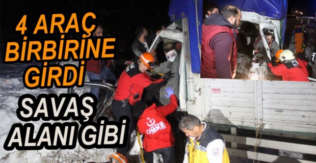 Bolu’da TEM otoyolunda 2 kamyon, 1 çekici ve 1 cipin karıştığı zincirleme trafik kazasında, kamyon sürücülerinden birisi sıkıştığı yerden itfaiye ekipleri tarafından kurtarıldı.