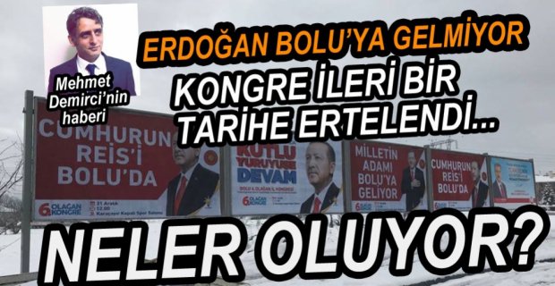 Cumhurbaşkanı Erdoğan’ın Bolu programının iptal olduğu ve kongrenin de ertelenebileceği iddiasını kamuoyuna Bolu Havadis Gazetesi İmtiyaz Sahibi Mehmet Demirci internet sitesinden yaptığı haberle duyurdu. İlerleyen saatlerde Bolu il kongresinin ileri bir tarihe ertelelendiği ve Recep Tayyip Erdoğan'ın Bolu'ya gelmeyeceği kesinleşti.