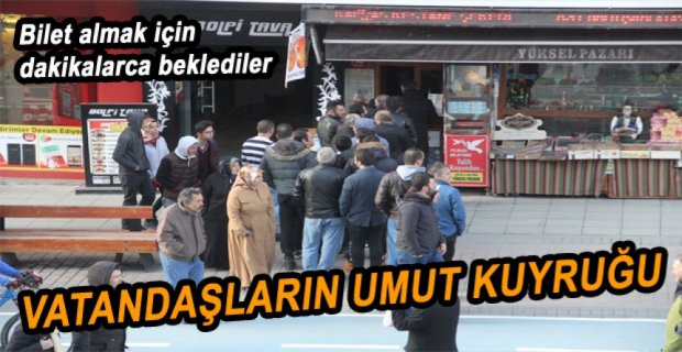 Milli Piyango yılbaşı ikramiyesini 61 Milyon TL olarak açıklamasının ardından, vatandaşlar biletlere yoğun ilgi göstererek almaya başlamıştı. İlimiz İzzet Baysal Caddesi’ndeki bayilere gelen vatandaşlar yılın son gününde, hayallerine açılacak olan bileti almak için uzun kuyruklar oluşturdu.