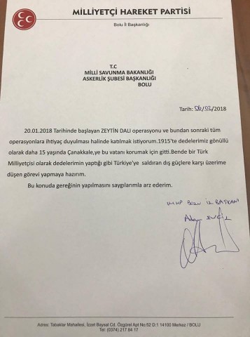 Türk Silahlı Kuvvetleri tarafından Afrin’deki Zeytin Dalı Harekatı’na bir destekte Milliyetçi Hareket Partisi Bolu İl Teşkilatı’ndan geldi. MHP Bolu İl, Merkez İlçe, Kadın Kolları İl Başkanlığı, aldıkları karar ile yapılan harekata katılabilmek için dilekçe imzalayarak başvuru yaptı.