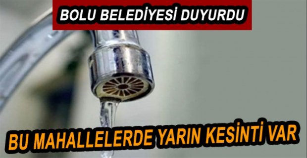 Su ve Kanalizasyon İşleri Biriminden yapılan açıklamada şöyle denildi, “Bolu Belediyesi tarafından yapılan bakım ve onarım çalışmaları nedeniyle 14 Şubat 2018 Çarşamba günü 08.00 – 17.30 saat arasında Kasaplar, Sandallar, Karaköy, Paşaköy ve Seyit Mahallelerinde su kesintisi yaşanacaktır. Bu mahallelerde ikamet eden vatandaşlarımıza önemle duyurulur.”