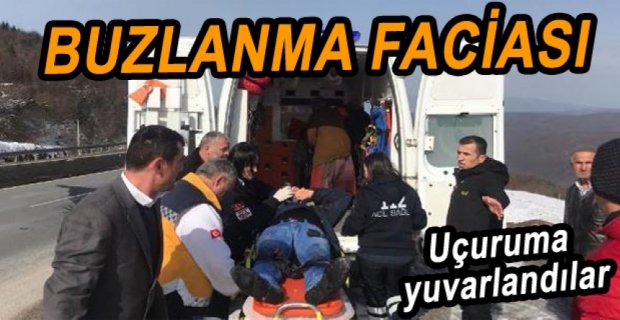 Bolu'dan Düzce'ye bir yakınlarının cenazesine giden anne ve oğlunun bulunduğu otomobil yoldaki buzlanma nedeniyle kontrolden çıkarak uçuruma yuvarlandı. Yaralı anne ve oğlunu, bölgede bulunan restoran çalışanları kurtardı.