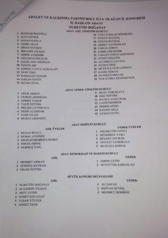 Ak Parti 6. Olağan İl kongresinde İl Başkanı Nurettin Doğanay’ın listesi belli oldu. Günlerdir Nurettin Doğanay’ın kimlerle çalışacağı tartışma konusu olurken, 29 kişiden oluşan Yönetim Kurulu listesi kongre ile onaylanmış oldu.