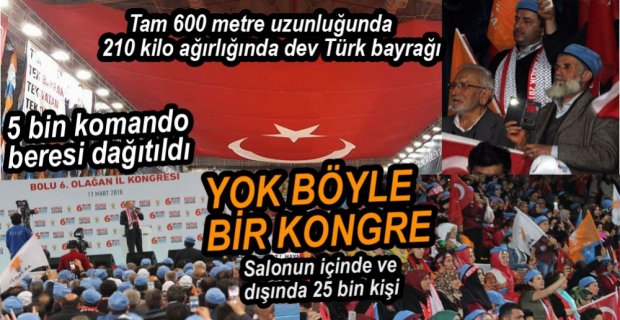 6. AK Parti Bolu İl Kongresi Cumhurbaşkanı ve AK Parti Genel Başkanı Recep Tayyip Erdoğan’ın katımılıyla yapılırken, tek listeyle seçime giden mevcut İl Başkanı Nurettin Doğanay tekrar İl Başkanı seçildi. Salonun süslemesi göz kamaştırırken, tavana asılan 800 kilogram ağırlığındaki 600 metrekare bayrak gözlerden kaçmadı. Kongreye gelenlere 5 bin komando beresi dağıtılırken, Erdoğan organizasyona övgüler yağdırdı. Kongreyi dışarıda ve salonda toplam 25 bin kişinin takip ettiği belirtildi.