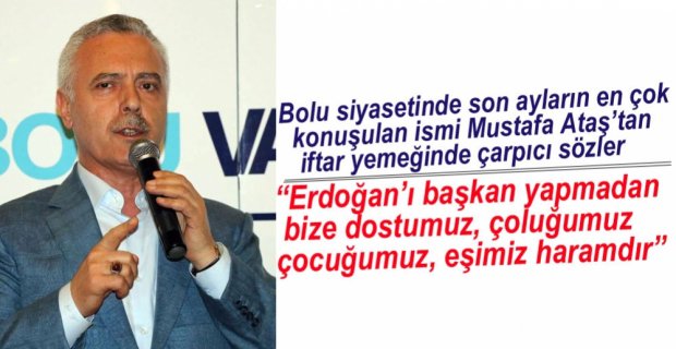 AK Parti Genel Başkan Yardımcısı Mustafa Ataş, "Recep Tayyip Erdoğan’ı bu ülkede başkan yapmadan bize uyku haramdır. Bize çoluk çocuğumuz, ailemiz haramdır. Eşimiz, dostumuz haramdır" dedi.