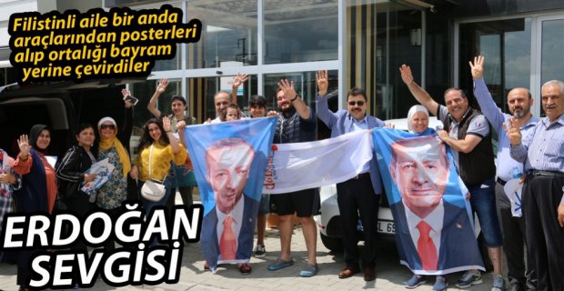 Filistinli aile AK Partililerin şaşkın bakışları ve alkışları arasında Erdoğan’a olan sevgilerini “dünya lideri”, “1 numara”, “aşkım” diyerek ve parti araçlarından çalan “Dombra” eşliğinde dans ederek gösterdiler.