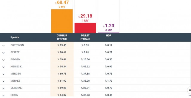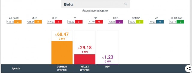 Bolu'da sandıkların tamamının açılmasına artık sayılı dakikalar kala ilçelerdeki durumlarda belli oldu. Cumhur İttifakı tüm ilçelerden birinci şekilde ayrılmayı başardı. Öte yandan bir çok ilçede Milliyetçi Hareket Partisi, 2'nci oldu. İşte ilçe ilçe Bolu'daki son durum