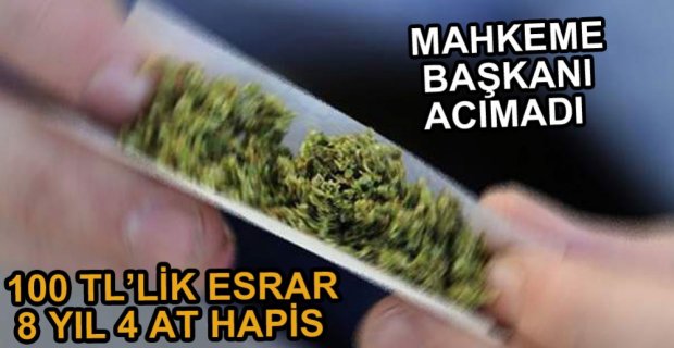 Bolu’da bir vatandaşa 100 TL değerinde esrar sattığı ve evinde de satışa hazır esrar bulunduğu tespit edilen şahsa Mahkeme Başkanı Seyfi Han 8 yıl 4 ay hapis ve 16 bin 660 TL para cezası verdi.