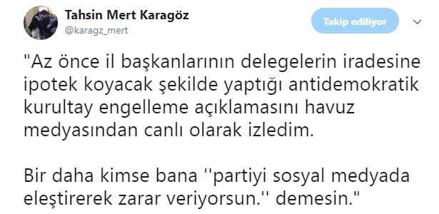 Yapılan bu açıklama sonrası Cumhuriyet Halk Partisi Bolu Gençlik Kolları Başkanı Tahsin Mert Karagöz, sosyal medya hesabından tepki gösterdi. Karagöz, kendisine ait sosyal medya hesabı üstünden yaptığı paylaşımda il başkanlarının, delegelerin iradesine ipotek koyduğunu söyledi. Karagöz, “Az önce il başkanlarının delegelerin iradesine ipotek koyacak şekilde yaptığı antidemokratik kurultay engelleme açıklamasını havuz medyasından canlı olarak izledim. Bir daha kimse bana ‘Partiyi sosyal medyada eleştirerek zarar veriyorsun’ demesin." ifadelerine yer verdi.