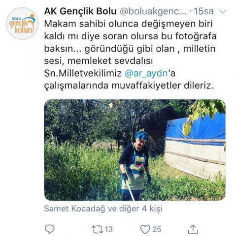 AK Parti Gençlik Kolları Bolu Teşkilatı’nın sosyal medya hesabı üzerinden ise Aydın’a övgü dolu bir paylaşım yapıldı. Yapılan paylaşımda, “Makam sahibi olunca değişmeyen biri kaldı mı diye soran olursa bu fotoğrafa baksın. Göründüğü gibi olan, milletin sesi, memleket sevdalısı, Milletvekilimiz Arzu Aydın’a çalışmalarında muvaffakiyetler dileriz” ifadelerine yer verildi.
