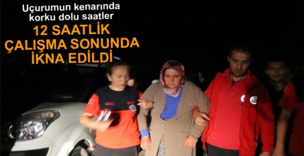 Uçurumdan atlamasından korkulduğu için kadının yanına yaklaşılmadı. İkna çalışmaları yeterli olmayınca bölgeye Aile ve Sosyal Politikalar İl Müdürlüğü’ne bağlı psikolog getirildi. Kadın, yaklaşık 12 saatlik çalışma sonucu ikna edildi. AFAD ve UMKE ekipleri kadının bulunduğu yere ulaşıp ip kullanarak indirdi. Zor arazi şartlarından yola kadar indirilen kadın, ambulansla kontrol amaçlı Kıbrıscık İlçe Devlet Hastanesi’ne kaldırıldı