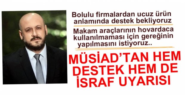 MÜSİAD Bolu Başkanı Abdullah Abat, Hazine ve Maliye Bakanlığı’nca Enflasyonla Topyekûn Mücadele programıyla ilgili olarak, “Bolumuzda da imalat ve üretim yapan konusu ne olursa olsun Türkiye ekonomisine katkı veren tüm firmalarımızdan talep ediyor ve bu süreçte gerek ürün bulunabilirliği ve ucuz ürün anlamında desteklerini bekliyoruz” dedi. Abat ayrıca, “Ve son olarak kamuda ki israfın da önüne geçilmesi açısından tüm seçilmişlerin ve bürokratların örnek teşkil etmesi açısından makam araç ve giderlerinin tasarruf tedbirleri adı altında hovardaca kullanılmaması için gereğinin yapılmasını arz ediyoruz” ifadelerini kullandı.
