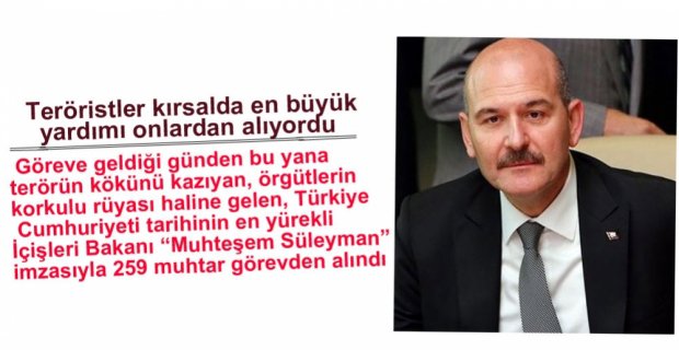 İçişleri Bakanı Süleyman Soylu, 103'ü köy muhtarı ile 156'sı mahalle muhtarı olmak üzere toplam 259 muhtarı terör örgütleriyle iltisakları veya irtibatları olduğu gerekçesiyle görevden aldı. İçişleri Bakanlığı, Doğu ve Güneydoğu'da PKK ile iltisaklı muhtar kalmaması için çalışma başlatmıştı. İçişleri Bakanlığı tarafından konuyla ilgili yapılan açıklama şu şekilde:
