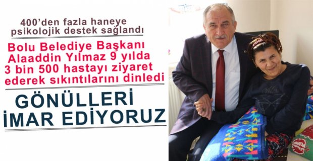 Bolu Belediye Başkanı Alaaddin Yılmaz, 9 yılda 3 bin 500 hastayı evlerinde ziyaret etti. Yılmaz, "Yaklaşık 9 yılda 3 bin 500 hastamızı evlerinde ziyaret ettik. 2018’in mayıs ayından bu yana ihtiyaç sahiplerine kişisel temizlik ve ev temizliği hizmeti, 400’den fazla haneye de psikolojik yardım eli uzattık" dedi.