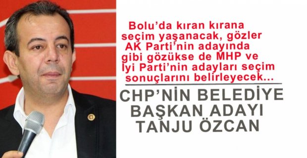 Edinilen bilgiye göre, yapılan kamuoyu anketlerinde partisinden açık ara birinci çıkan CHP Bolu Milletvekili Tanju Özcan için gene merkez kararını verdi ve Bolu Belediye Başkan adayı olarak gösterilmesine karar verildi. Çarşamba günü yapılacak olan MKYK toplantısından sonra CHP Genel Başkanı Kılıçdaroğlu, Tanju Özcan’ı Bolu Belediye Başkan adayı olduğunu kamuoyu ile paylaşacak.
