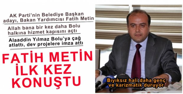 AK Parti’nin Bolu Belediyesi Başkan Adayı Ticaret Bakan Yardımcısı Fatih Metin olduğu kesinleşti. Cumartesi günü Haliç Kongre Merkezi’nde Cumhurbaşkanı Recep Tayyip Erdoğan tarafından adaylığı resmi olarak açıklanacak olacak olan Fatih Metin, “Şimdiden tüm Bolu’muza hayırlı olsun, en kısa sürede Bolu’ya gelerek çalışmalara başlayacağım” dedi. Metin ayrıca, mevcut Belediye Başkanı Alaaddin Yılmaz’dan da övgüyle bahsederek, “Belediye Başkanımız görev süresince Bolu’ya adeta çağ atlattı. Çok önemli projelere imza attı. Bu bir bayrak yarışıdır” dedi.