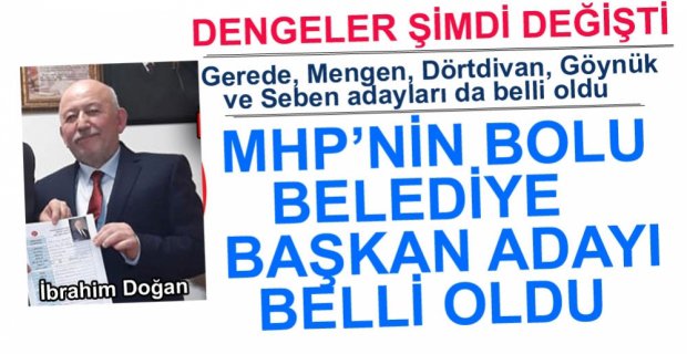 Milliyetçi Hareket Partisi Genel Başkan Yardımcısı Sadir Durmaz, 15’i il olmak üzere 402 belediye başkan adayının daha ismini açıkladı. Milliyetçi Hareket Partisi Bolu Belediye Başkan Adayı İbrahim Doğan olurken, Dörtdivan Durmuş Ünal, Gerede Ramazan Güler, Göynük Ahmet Çankaya, Mengen Ali Budak ve Seben Hakan Cankurtaran oldu.