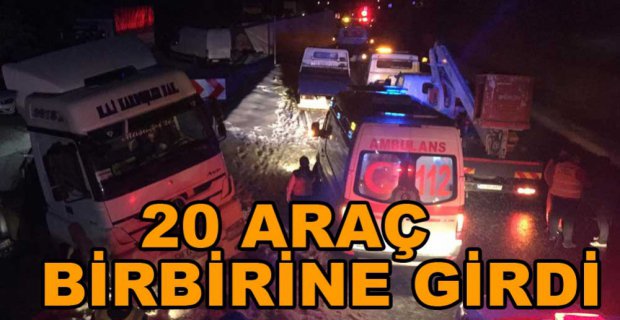 Kaza, 20.30 sıralarında Bolu'nun Gerede İlçesi D-750 Karayolu Kalender Pikinik mevkiinde meydana geldi. 20'ye yakın aracın karıştığı kazada çok sayıda yaralı olduğu öğrenildi. İlk belirlemelere göre 7-8 tırın aralarında olduğu 15 aracın karıştığı kaza alanına toplam 6 ambulans, 1 UMKE ve itfaiye ekipleri yönlendirildi. Ankara'dan takviye ekip istenilen kaza nedeniyle yol trafiğe kapanırken, kaza alanında sağlık ekipleri yaralılara müdahale ediyor.