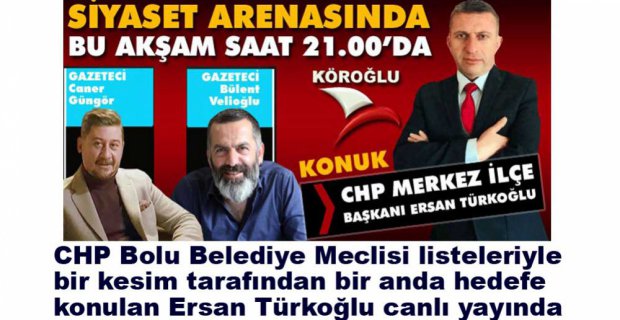 Bolu Gazetesi İmtiyaz Sahibi Caner Güngör’ün moderatörlüğünde Bolu Gazeteciler Cemiyeti Başkanı ve Özgür Bolu Haber Portalı Editörü Bülent Velioğlu’nun katıldığı Siyaset Arenası Programı’nın konuğu CHP Merkez İlçe Başkanı Ersan Türkoğlu.