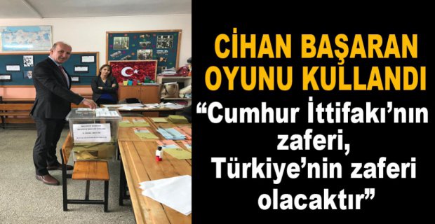 Cihan Başaran oyunu kullandı. Oy kullandığı okulda açıklama yapan Başaran, “ Liderimiz Devlet Bahçeli Beyefendinin dediği gibi seçim çalışmaları sürecimizde çalınmadık kapı, sıkılmadık el, girilmedik gönül bırakmadık.Bolu da Milliyetçi Hareket Partisi İl, İlçe ve Kadın Teşkilatlarımız, Ülkü Ocaklarımız, Belediye Başkan adaylarımız, encümen adaylarımız, il genel meclis adaylarımız ve çok kıymetli hemşehrilerimiz ile birlikte el ele, omuz omuza, yürek yüreğe verdik.