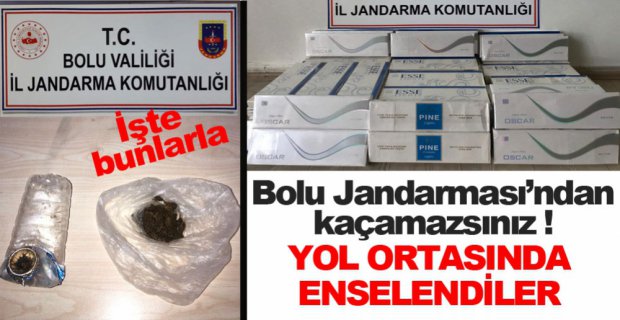 Gerede-Dörtdivan arasında Bolu İl Jandarma Komutanlığı unsurlarınca yapılan yol kontrol ve arama faaliyeti neticesinde Metro Dinlenme Tesisleri mevkiinde, iki yolcu otobüsünde yapılan aramada; 6 şüpheli şahıs ile birlikte 1.440 paket bandrolsüz kaçak sigara, bir TIR’da yapılan aramada ise 1 şüpheli şahıs ile birlikte 7 gram esrar (skunk) maddesi ele geçirilerek şahıslar hakkında yasal işlem başlatıldı.