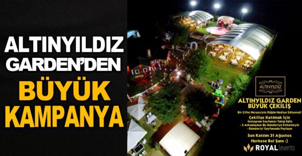 Sedat Altınyıldız’ın sahibi olduğu Altınyıldız Garden, evlenecek çiftler için muhteşem bir kampanya düzenledi. Kampanya koşullarını yerine getirerek çekilişe katılan şanslı 1 kişi, Paşaköy Mahallesi, D-100 Karayolu üzeri Gölköy Kavşağı’nda bulunan Altınyıldız Garden Düğün Salonu’nda, 2020 yılında gerçekleştirilecek olan görkemli bir düğün hediyesine sahip olacak.
