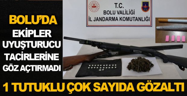 Bolu İl Jandarma Komutanlığı ekiplerinin 2ayrı bölgede yaptıkları uyuşturucu operasyonunda gözaltına alınan 9 kişiden 1’i tutuklanarak cezaevine gönderildi. Yapılan operasyonlarda 65 gram esrar, 26 adet uyuşturucu hap ile 2 adet ruhsatsız av tüfeği ele geçirildi.