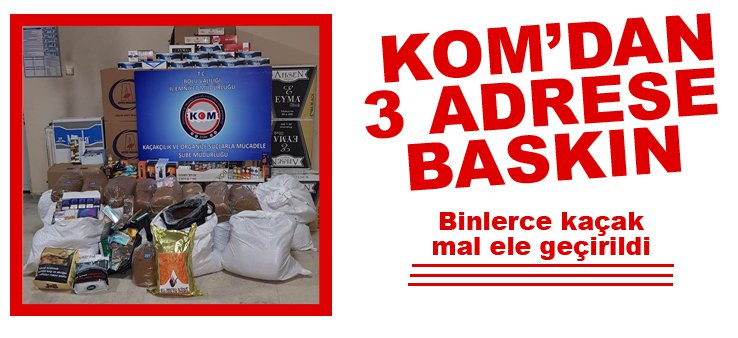 Edinilen bilgiye göre, İl Emniyet Müdürlüğü Kaçakçılık ve Organize Suçlarla Mücadele Şube Müdürlüğü ekipleri tarafından Bolu’da, Ş.A. isimli şahsa ait adreslerde kaçak tütün, sigara ve elektronik sigara bulunduğuna dair ihbar aldı. İhbarı değerlendiren ekipler Ş.A.’nın depo ve iş yeri olarak kullandığı 3 farklı adrese baskın yaparak arama gerçekleştirdi. Yapılan aramalar sonucunda 17 adet elektronik sigara, 151 adet elektronik sigara likiti, 96 elektronik sigara ağızlığı, 10 kilogram 202 gram pipo tütünü, 184 kilogram 220 gram kıyılmış tütün, 150 bin boş makaron, 40 bin 280 dolu makaron, 21 paket sigara, 40 adet puro, 229 adet TAPDK bandrolü ele geçirilirken, Ş.A. gözaltına alınıp ifadesi alınmak üzere emniyete götürüldü.