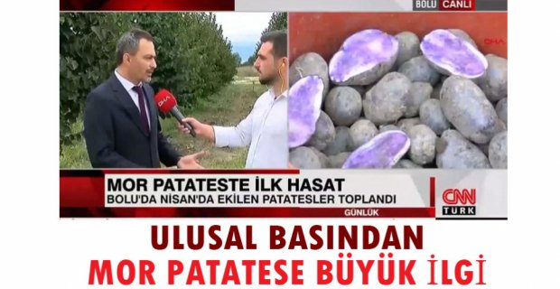 Bolu Belediyesi terefından nisan ayında ekilen ve ilk hasadı dün yapılan mor patates ulusal basında geniş yer buldu. CNN Türk kanalı, DHA Muhabiri Murat Küçük'ün anlatımıyla Park ve Bahçeler Müdürlüğü'nden canlı yayın yaptı. Yayında Bolu Belediye Başkan Yardımcısı Rasim Özdemir ile Park ve Bahçeler Müdürü Aylin Aydın mor patates hakkında bilgiler verdi.
