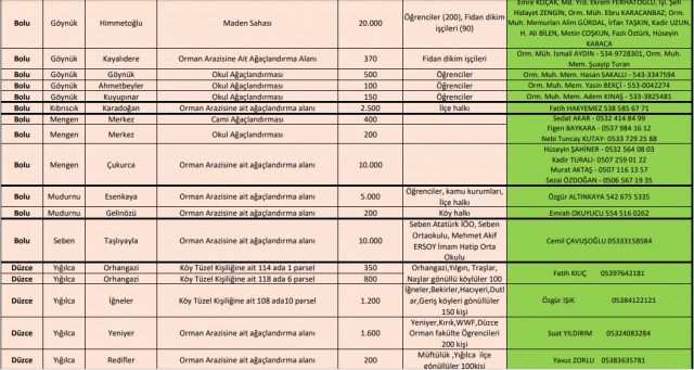 Bolu Bölge Orman Müdürlüğü, Bolu İl merkezleri ile ilçelerdeki gerçekleştirilecek etkinliklerde, fidanların dikileceği konum bilgileri listesini paylaşarak şu ifadelere yer verdi: “Ülkemizde ağaç ve orman sevgisini geliştirmek, toplumun bütün kesimlerinin çevreye olan duyarlılıklarına katkı sağlamak, özellikle son aylarda çıkan orman yangınları neticesinde zarar gören alanların yeniden ağaçlandırma konusunda vatandaşların yoğun taleplerine karşılık vermek ve toplumda çevre konusunda farkındalığı artırmak maksadıyla gelecek nesillere daha yeşil bir Türkiye bırakmak için gerçekleştirilecek “Geleceğe Nefes” seferberliği kapsamında öğrencilerden askeri birliklere, sivil toplum örgütlerinden kamu kurum ve kuruluşlarına, esnafından işçisine kısaca 7 den 77’ye toplumun bütün kesimlerinden katılacak vatandaşlarımızın katkılarıyla 11 Kasım 2019 günü saat 11.11’de 81 ilimizde 2023 farklı lokasyonda aynı anda 3 saatlik bir zaman dilimi içerisinde ülke genelinde 11 milyon adet fidanı toprakla buluşturulacak.”