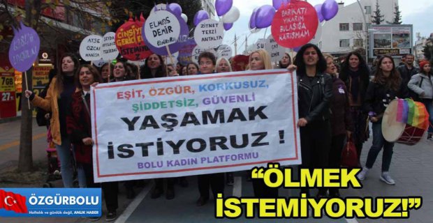 Kadına yönelik şiddetin önlenmesine dikkat çekmek amacıyla düzenlenen yürüyüşte ‘ölmek istemiyoruz, yaşamak istiyoruz’ gibi sloganlar atıldı. Bolu Kadın Platformu’nun öncülüğünde düzenlenen yürüyüş kapsamında platform adına konuşan Sevcan Altun Bozoğlan, şu ifadelere yer verdi: “Uluslararası tekellerin aşırı kar hırsı; eşitsizlik, şiddet, işsizlik, yoksulluk, açlık, savaş, göç ve ekolojik yıkım akıl almaz boyutlara ulaşmış durumdadır. Neoliberal Politikalar tüm dünyada kadınları güvensizliğe, işsizliğe, eril zihniyete ve aileye daha çok mahkum etmektedir. Kadınların birçok hakkını 100 yıl önce elde ettiği ülkelerde bugün seçme seçilme, boşanma, sosyal güvenceye sahip olma, eşit işe eşit ücret gibi en temel medeni, sosyal ve ekonomik haklar ayakları altına alınmaktadır. Diğer yandan da tüm bu saldırılara ve yarattığı şiddet biçimlerine, kürtaj yasaklarına, yoksulluğa işsizliğe, ayrımcılığa karşı dünyanın her yerinde kadınların itiraz ve direnişleri yükselmektedir.