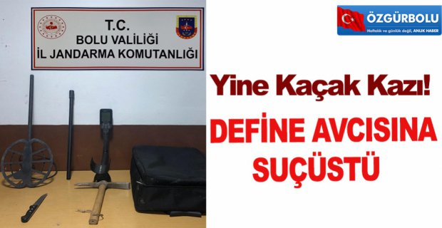Edinilen bilgiye göre, İl Jandarma Komutanlığı ekipleri, Bolu’nun Mudurnu ilçesine bağlı Hacıhalimler Köyü yakınlarında kaçak kazı yapıldığı yönünde bilgi aldı. Gelen ihbarı değerlendiren Jandarma ekipleri yaptıkları operasyonda kazı bölgesinde 1 adet detektör, 1 adet kazma ele geçirdi. Olay yerinde yakalanan 1 kişi hakkında ise yasal işlem başlatıldı.