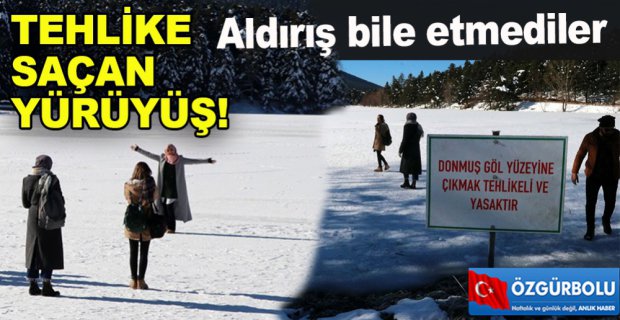 Bolu’da bulunan, kartpostallık manzarasıyla ziyaretçilerin gözdesi olan Gölcük Tabiat Parkı’na gelen bazı tatilciler, tehlikeli ve yasak olmasına rağmen buz tutan gölün üzerine çıkarak fotoğraf çektirdi. Umursamaz ziyaretçiler, donmuş gölün üzerinde bir de yürüyüş yaptı.