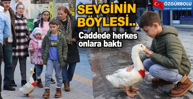 İstanbul’dan Bolu’ya üniversitede öğrenim gören çocuklarını ziyarete ve tatile gelen Ay ailesi, 6 ay önce civcivken alarak besledikleri ördeği de yanlarında getirdi. Güneşli havayı fırsat bilen aile, kentin en işlek caddesi İzzet Baysal Caddesi’nde ördekleri ile yürüyüşe çıktı. 10 yaşındaki Eren Ay ve ailenin peşinden bir an olsun ayrılmayan ördek vatandaşlardan yoğun ilgi gördü. Ördekle küçük çocuk arasındaki bağ ise görenleri şaşırttı.
