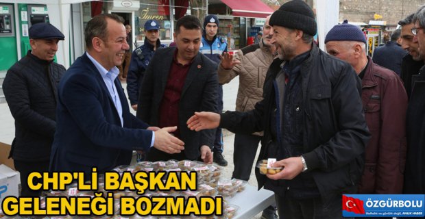 Üç ayların başlangıcı olan Regaip Kandili dolayısıyla her yıl olduğu gibi bu yıl da Belediye önünde lokma dağıtıldı. Bolu Belediye Başkanı Tanju Özcan’ın da bulunduğu etkinliğe Belediye Basın Sözcüsü Rasim Özdemir, CHP Kadın Kolları İl Başkanı Zuhal Toker Işın da katılım gösterdi. Başkan Tanju Özcan, vatandaşlara kendi eliyle lokma ikram etti.