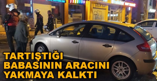 Babasının aracını kundaklamak isteyen Mehmet Can K., ifadesi alınmak üzere polis merkezine götürülürken olayla ilgili soruşturma başlatıldı.