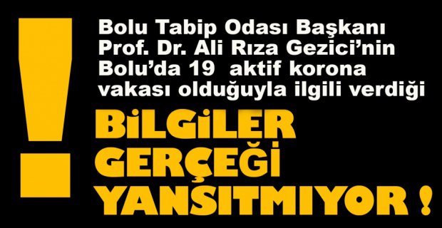 Haber merkezimizin edindiği bilgilere göre Prof.Dr. Gezici’nin açıkladığı rakamların gerçeği yansıtmadığı ortaya çıktı. Bolu’daki vaka sayısının açıklanan rakamlardan daha fazla olduğu öğrenildi. Kentteki pandemi hastanelerinde tedavi gören hasta sayısının az gösterilmesinin vatandaşlarda rehavet yaratmasına neden olduğu belirtildi.