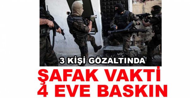 İl Emniyet Müdürlüğü Terörle Mücadele Şubesi ekipleri, terör örgütü DEAŞ’a yönelik başlatılan soruşturma kapsamında örgüt üyelerinin saklandıkları hücre evlerine şafak vakti operasyon yaptı. Eş zamanlı olarak 4 eve düzenlenen operasyonda Suriye uyruklu 3 şüpheli gözaltına alındı. Şüphelilerin evlerinde yapılan aramada örgütsel dökümanlar ele geçirildi. Hakkında gözaltı kararı bulunan bir şüphelinin yakalanması için çalışmalar devam ediyor. Şüphelilerin emniyetteki işlemleri sürüyor.