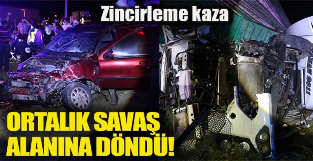Meydana gelen trafik kazasında tır, kamyon ve otomobil sürücüleri ile otomobilde yolcu olarak bulunan Sümeyye, Coşkun Taha ve Şennur Çevik ile Seda Ekici yaralandı. Kazada araçları içinde sıkışan kamyon ve tır sürücüleri, sıkıştıkları yerden olay yerine gelen sağlık ekipleri tarafından çıkartıldı.