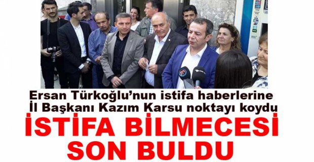 CHP Bolu Merkez İlçe Başkanı Ersan Türkoğlu'nun istifa ettiği haberler sonrasında partiden ilk kez net bir açıklama yapıldı. CHP İl Başkanı Kazım Karsu, "Partimizi hem içerden hem de dışarıdan karıştırmak isteyen aldanmışlar ise her seçim döneminde olduğu gibi yine hayal kırıklığı yaşayacaktır" ifadelerini kullandı.