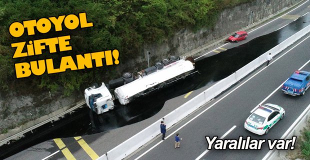 Düzce'de D-100 kara yolunda devrilen zift yüklü tankerin otomobile çarpması sonucu 3 kişi yaralandı, ulaşım çift yönlü kapatıldı.