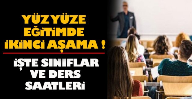 İlkokul 1, 2, 3 ve 4’üncü sınıf ile ortaokul 8’inci sınıflarda haftada 2 gün, toplam 12 ders saati (2 gün, 6+6), imam hatip ortaokullarında ise haftada 2 gün, toplam 14 ders saati (2 gün, 7+7 ) uygulanacak. Lise hazırlık sınıfları ve 12’inci sınıflarda ise haftada 2 gün toplam 16 ders saati (2 gün, 8+8) yapılacak. Okul öncesi eğitim kurumlarının tamamında, haftada 5 gün ve günde 6 etkinlik saati olacak şekilde yüz yüze eğitim yapılacak.