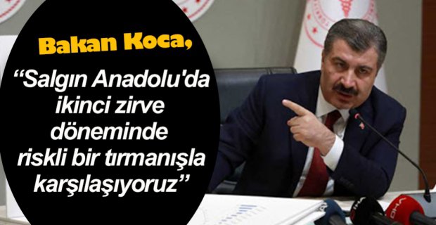 Sağlık Bakanı Fahrettin Koca, Türkiye'de son dönemlerde koronavirüs salgını artışına ilişkin yaptığı açıklamada, "Salgın Anadolu'da ikinci zirve döneminde riskli bir tırmanışla karşılaşıyoruz" dedi.