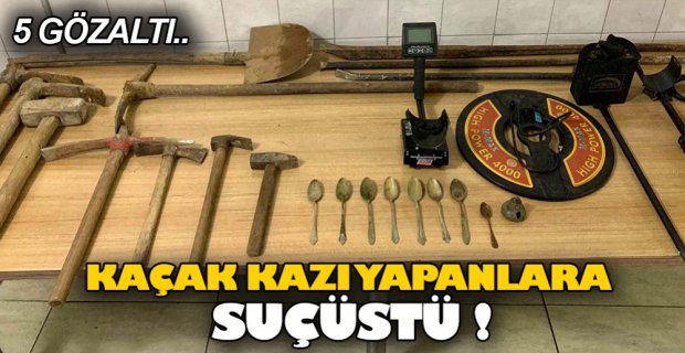 Bolu'da kaçak kazı yapan 5 kişi hakkında yasal işlem başlatıldı. Yakalanan şüphelilerle birlikte 2 adet el detektörü ve 21 adet çeşitli kaçak kazı malzemesi ele geçirildi.