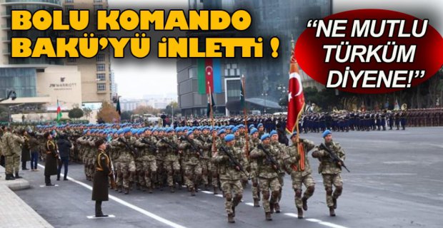 Azerbaycan’ın ordusunun Dağlık Karabağ’da elde ettiği zafer dolayısıyla 10 Aralık’ta başkent Bakü’de, askeri geçit töreni düzenlenecek. Cumhurbaşkanı Erdoğan’ın da katılacağı askeri geçit töreninde Bolu Komanda Tugayı da yer alacak. Başkent Bakü’de düzenlenecek tören için tüm cadde ve sokaklar Türk bayrakları ile donatıldı. Bolu Komando Tugayı’nın da yer aldığı askerler, başkent sokaklarında “Ne Mutlu Türküm Diyene” “Şehitler Ölmez, Vatan Bölünmez” ve “Her Şey Şehitler İçin” sloganlarıyla tören provası yaptı.