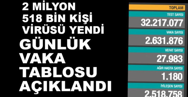 Yapılan açıklamada, tedavi altında olan 7 bin 210 kişi iyileşerek taburcu edildi. Virüsü yenenlerin sayısı 2 milyon 518 bin 758’ye ulaştı. Ölümcül virüse bugün 80 kişi yenildi. Hayatını kaybedenlerin sayısı ise 7 bin 983'e yükseldi.