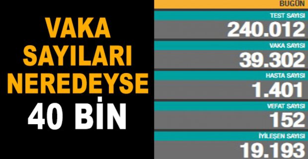 Bugün toplam 240 bin 12 test yapılırken, 39 bin 302 yeni vaka tespit edildi. Tabloya göre, son 24 saatte 152 kişi korona virüsünden hayatını kaybetti. Toplam can kaybı 31 bin 537'ye yükseldi. Bugün iyileşen 19 bin 193 kişiyle birlikte toplam iyileşen hasta sayısı 3 milyon 14 bin 226'ya yükseldi. Toplam ağır hasta sayısının ise 2 bin 82 olduğu açıklandı.