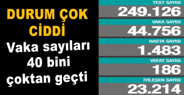 Bugün toplam 249 bin 126 test yapılırken toplam test sayısı 39 milyon 319 bin 889’a ulaştı. Gün içinde koronavirüs nedeniyle hayatını kaybedenlerin sayısı 186 oldu. Vaka sayıları, bugün 44 bin 756’ya Türkiye genelinde ise toplam, 3 milyon 445 bin 52’ye çıktı. Bugün iyileşen 23 bin 214 kişiyle beraber toplam iyileşen sayısı 3 milyon 82 bin 676 oldu. Ağır hasta sayısı 2 bin 231’e çıktı.